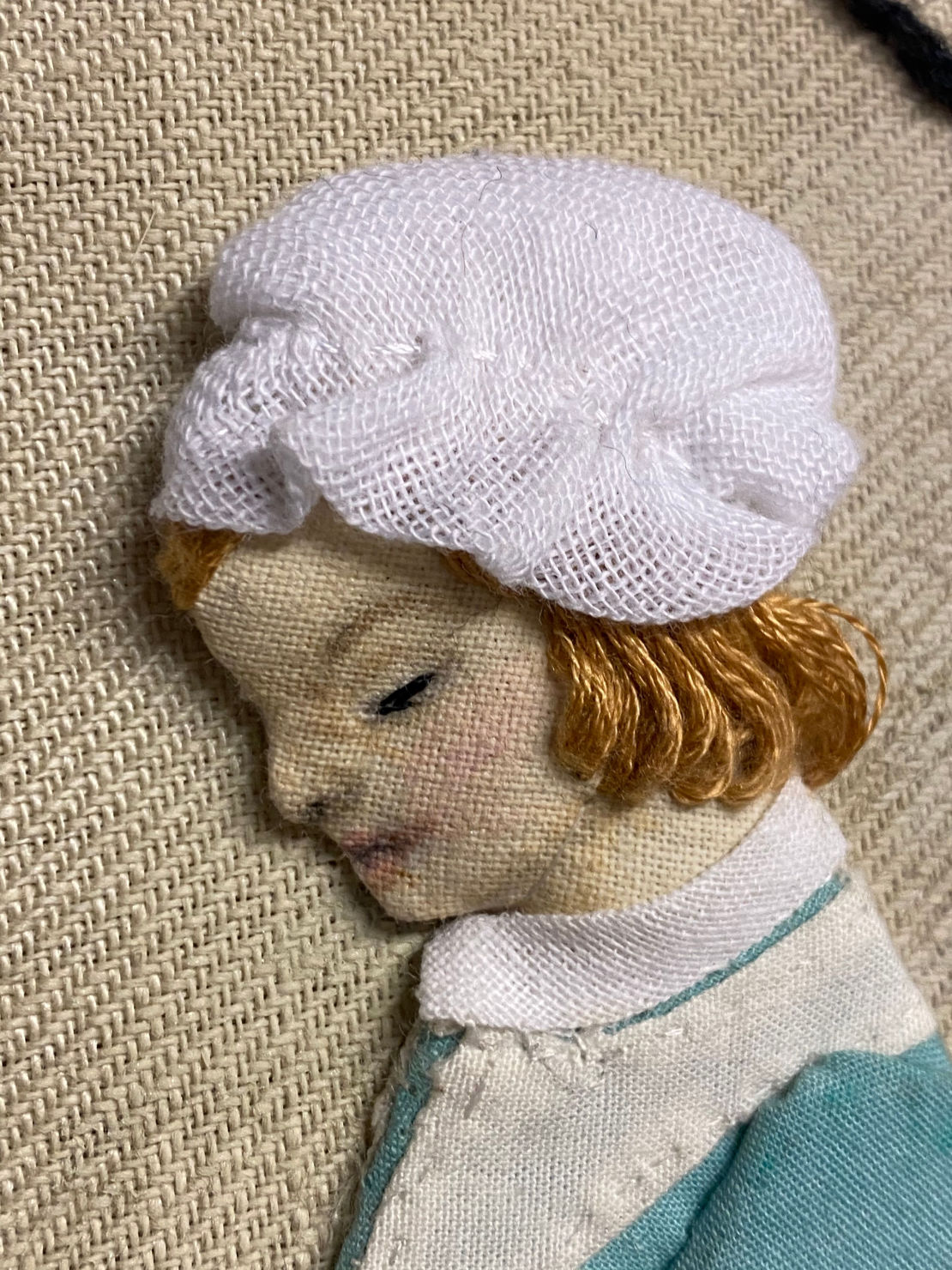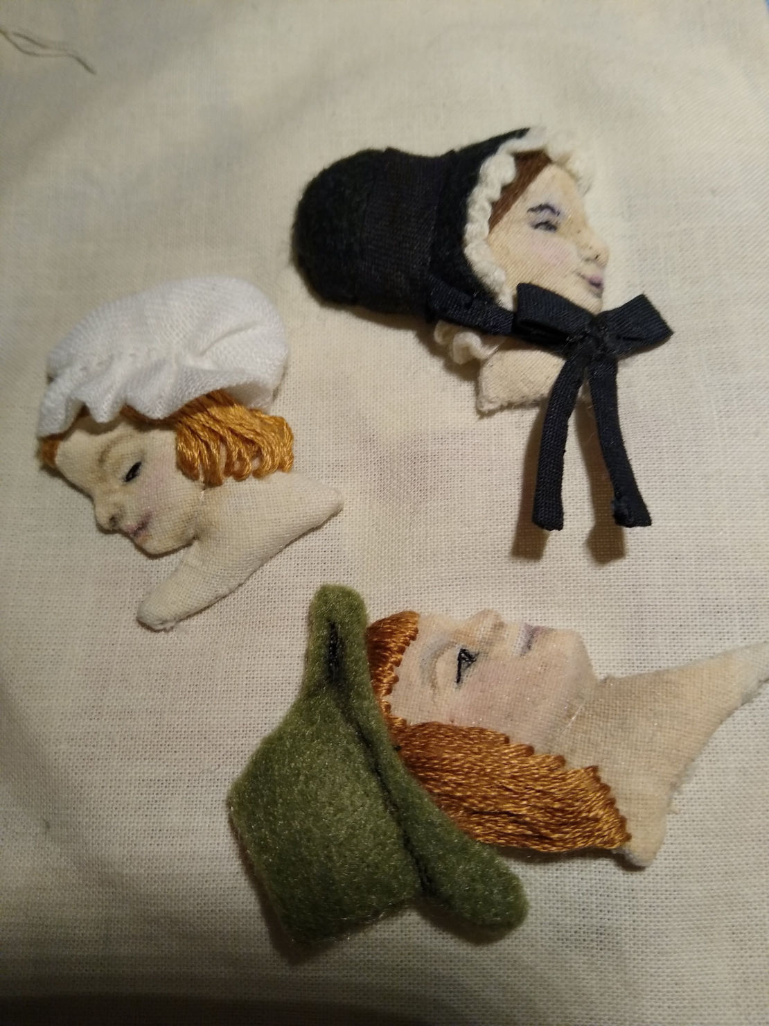 5. Other 3D techniques include stump work and needlelace. The heads were assembled prior to being stitched to the panel.