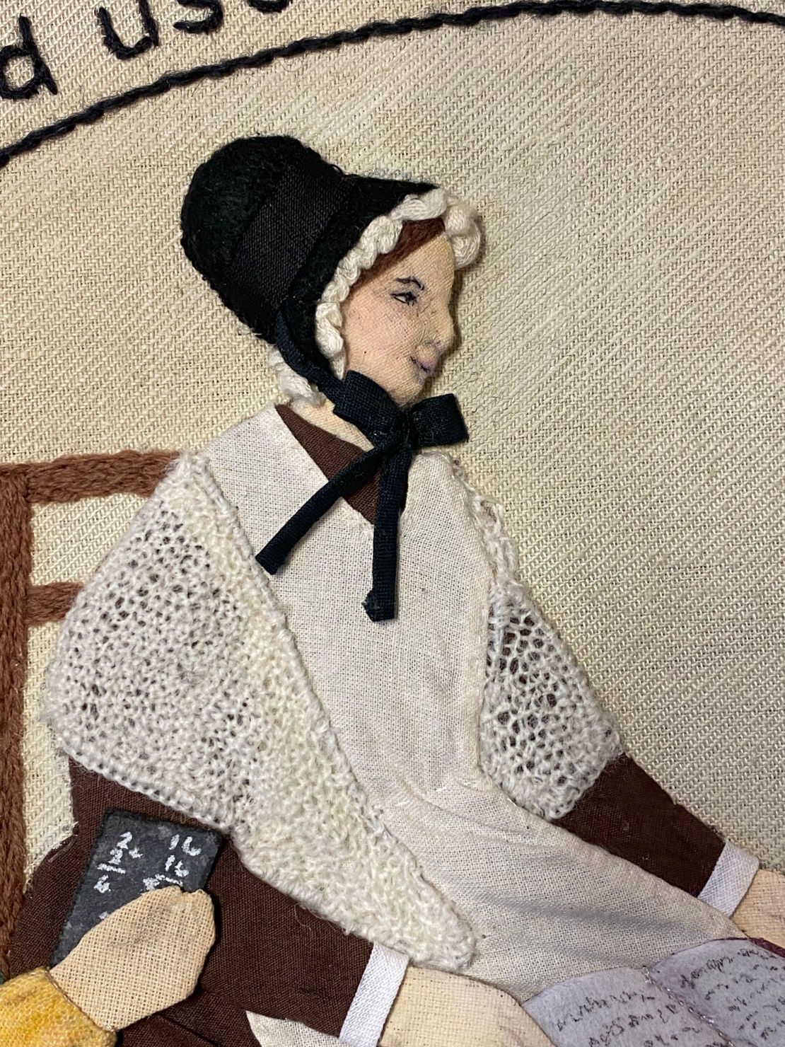 1. Design based on a theme from Methodist history: Wesley’s encouragement of women to exercise their talents as class leaders, teachers and at prayer meetings. This is a local story of Jane Salkeld, teaching the children in her care, the image drawn from imagination and background knowledge of clothing of the era.
