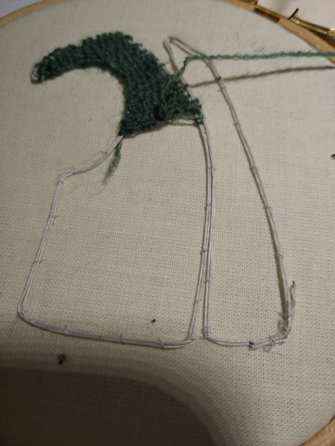 2. After David, the artist, transferred the design to linen using a lightbox, our Technical Adviser Tracy chose appropriate colours in crewel wool for a starter pack. This was issued to the stitcher with some guidance notes. Norma, one of the members of Stitch 2 Durham, took on this design and used a variety of techniques including appliqué.